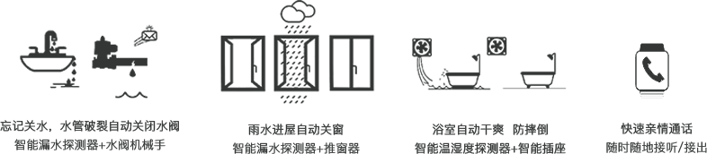 智慧養(yǎng)老系統(tǒng)具備智能漏水探測器,智能溫濕度探測器,智能插座等設備可自動關閉水閥,浴室自動干爽,自動關窗,落實到每一處細節(jié),時刻守護老人。