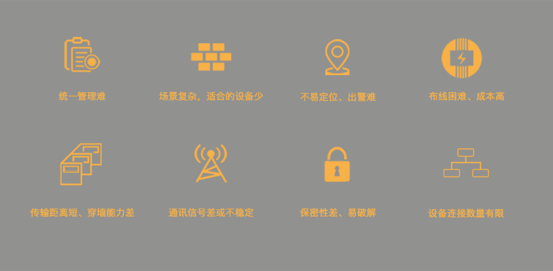 傳統(tǒng)消防產(chǎn)品的問題主要存在于統(tǒng)一管理難,場景復(fù)雜,適合的配備少,不易定位,出警難布線困難、成本高,傳輸距離短,穿墻距離短,穿墻能力差,輸出信號不穩(wěn)定等一系列難題。